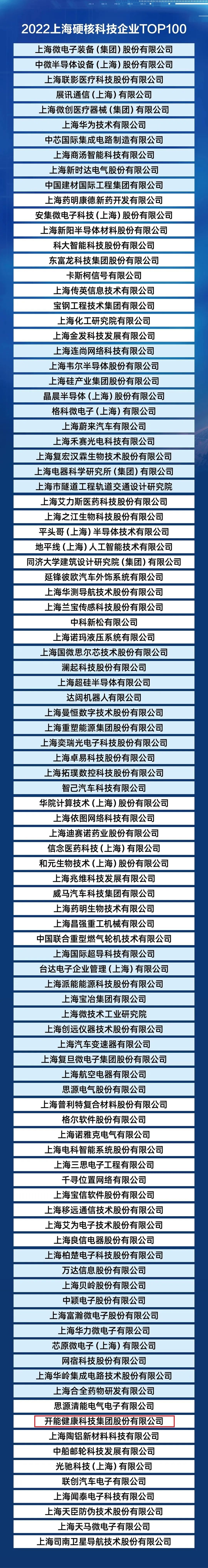 2022-07-287月21日, 2022上海硬核科技企业TOP100榜单发布,开能健康凭借全球化智造产业实力和创新性自主研发能力荣登百强榜单。