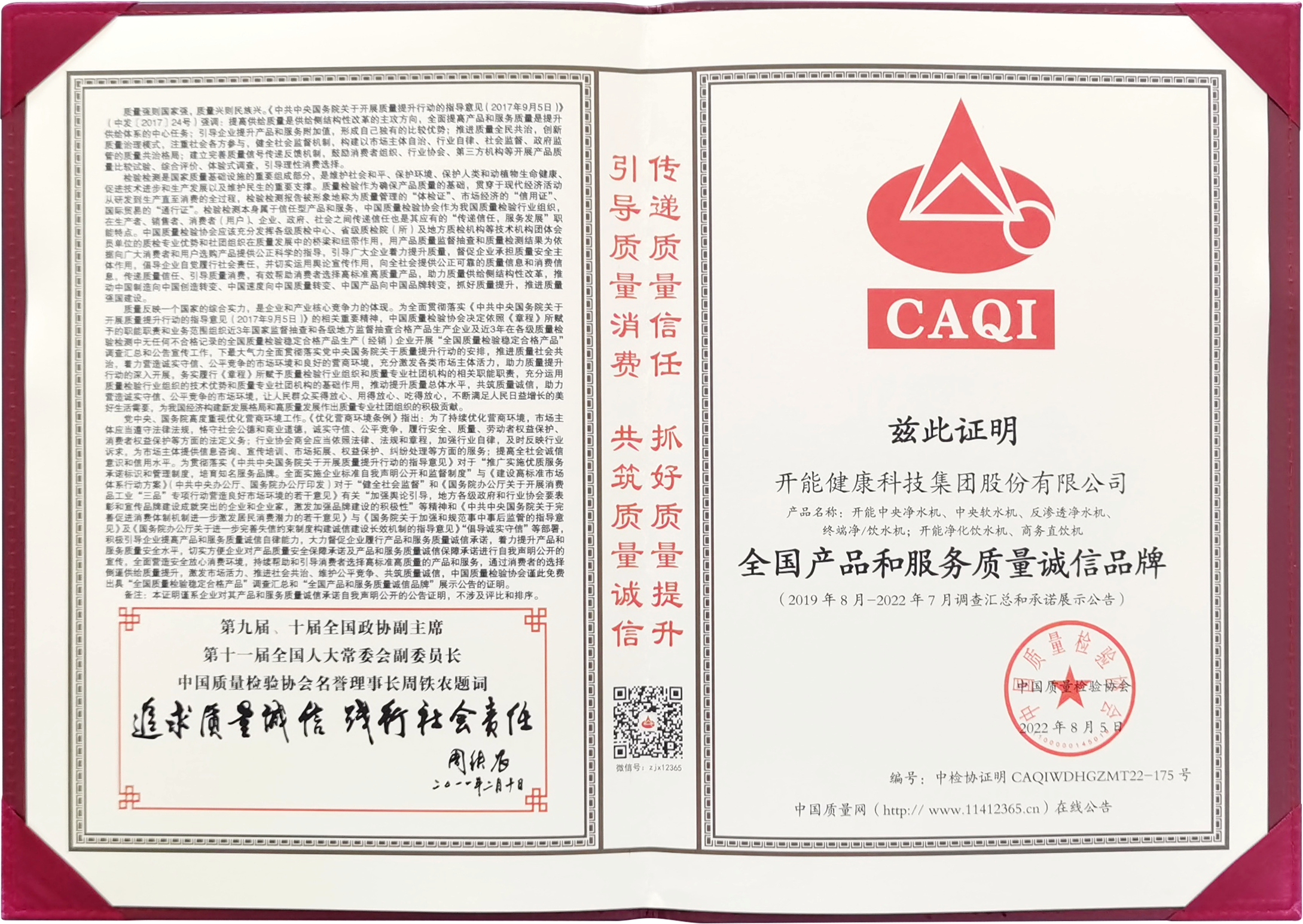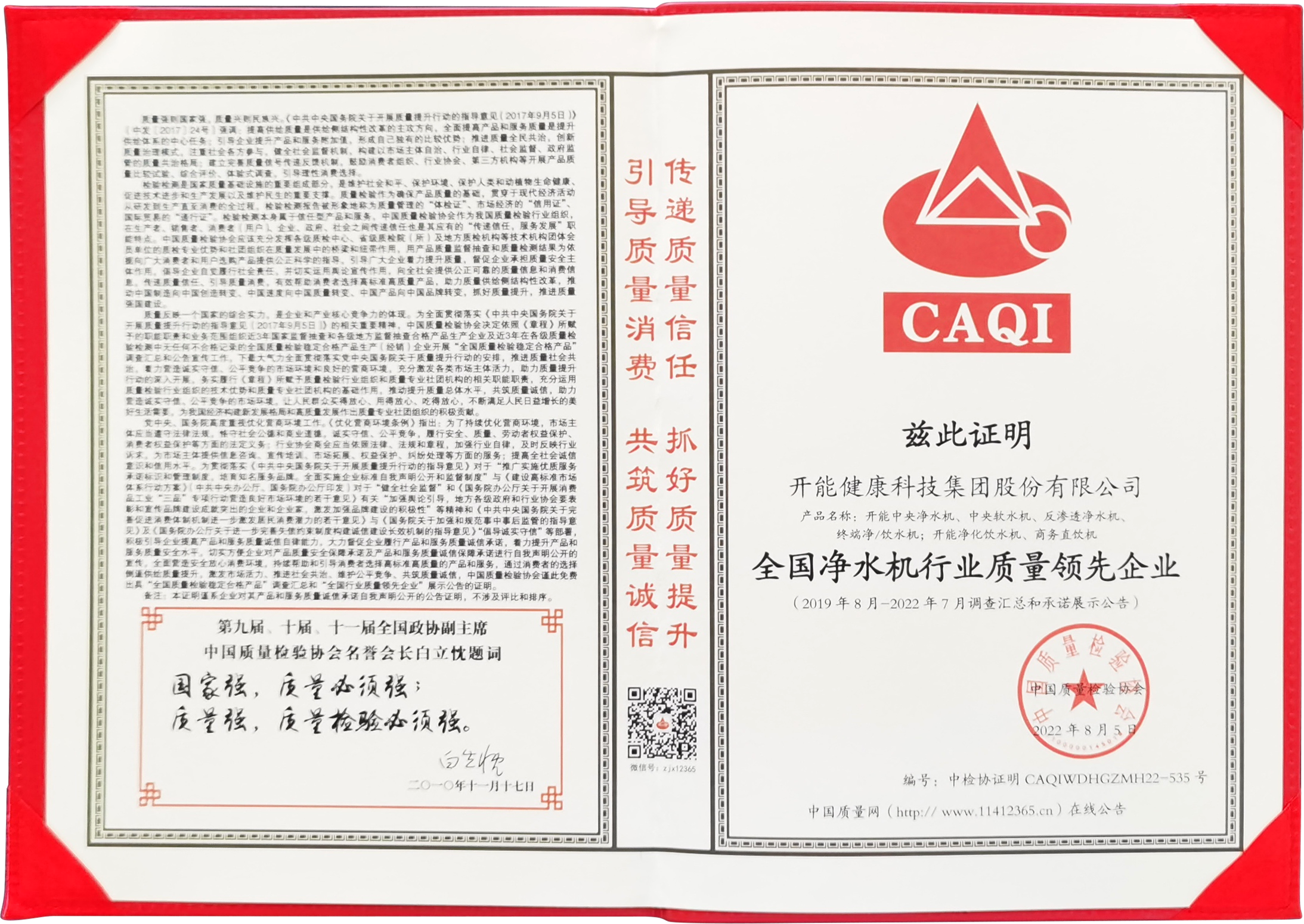 日前,中国质量检验协会开展了2020年“质量月”活动。开能凭借先进的生产工艺、扎实可靠的产品品质荣膺“全国净水机行业质量领先企业”、“全国产品和服务质量诚信品牌”、“全国质量检验稳定合格产品”三项质量大奖。