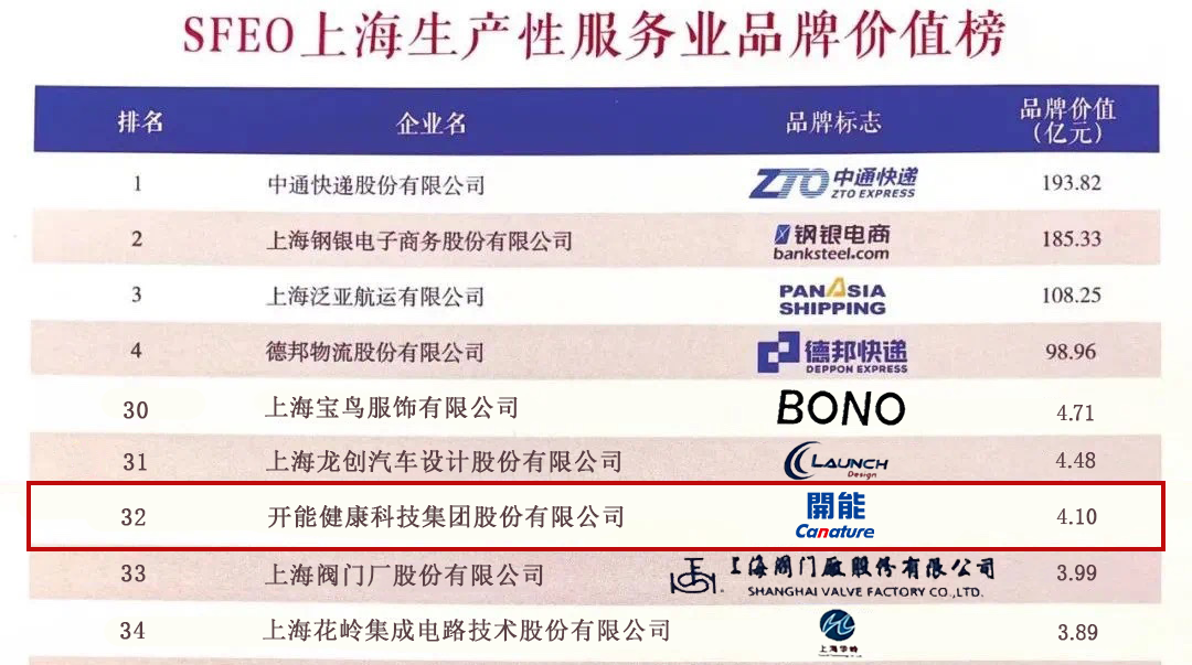 开能健康入选“SFEO上海生产性服务业品牌价值榜”
