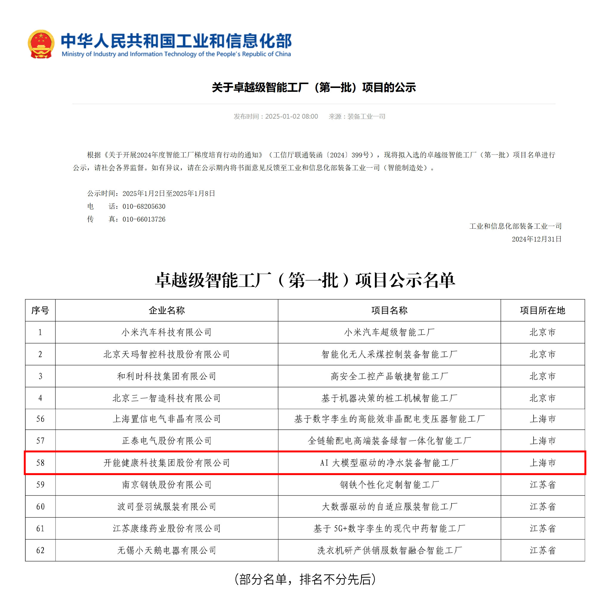 新年伊始,飞艇168官方开奖历史(以下简称“开能健康”)在智能制造领域实现了开门红。近日,工信部公示了全国首批卓越级智能工厂项目名单,开能健康以“AI大模型驱动的净水装备智能工厂”项目成功入选,这是对公司长期以来坚持技术创新和数字化转型的高度肯定。这也是继荣获“国家级绿色工厂”和“国家服务型制造示范企业”称号后,开能健康再次获得的国家级荣誉。