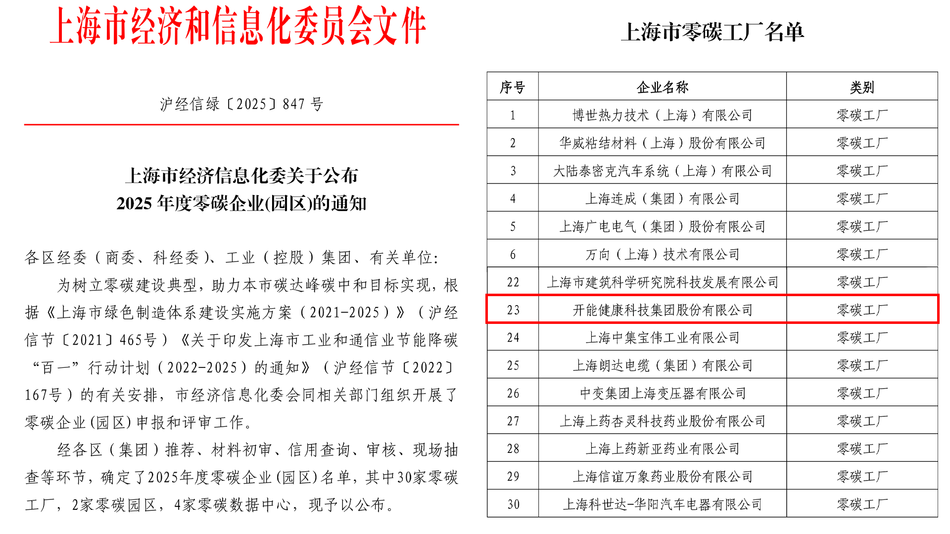 开能健康上榜上海市零碳工厂名单
